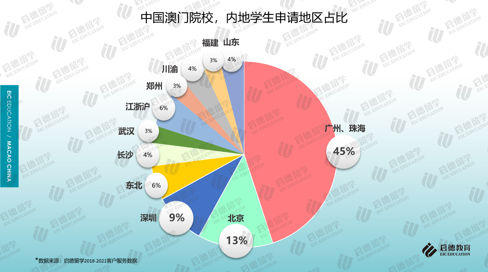 另一組啟德留學的澳門院校申請人來源數(shù)據(jù)顯示,廣東省廣州、珠海、深圳三個城市的學生申請澳門院校的占比超過50%,北京學生占比13%,分析原因,除了廣東省與澳門在文化上、生活方式上的親近性以及距離較近的優(yōu)勢外,也與澳門院校對部分區(qū)域申請人的加分政策有一定關(guān)系。如澳門大學對北京市及廣東省高考考籍的學生有加5分的優(yōu)惠政策,而對于廣東省珠海市考籍和橫琴戶籍的應(yīng)屆高考生又特別優(yōu)待,實施15-20分的加分優(yōu)惠政策。