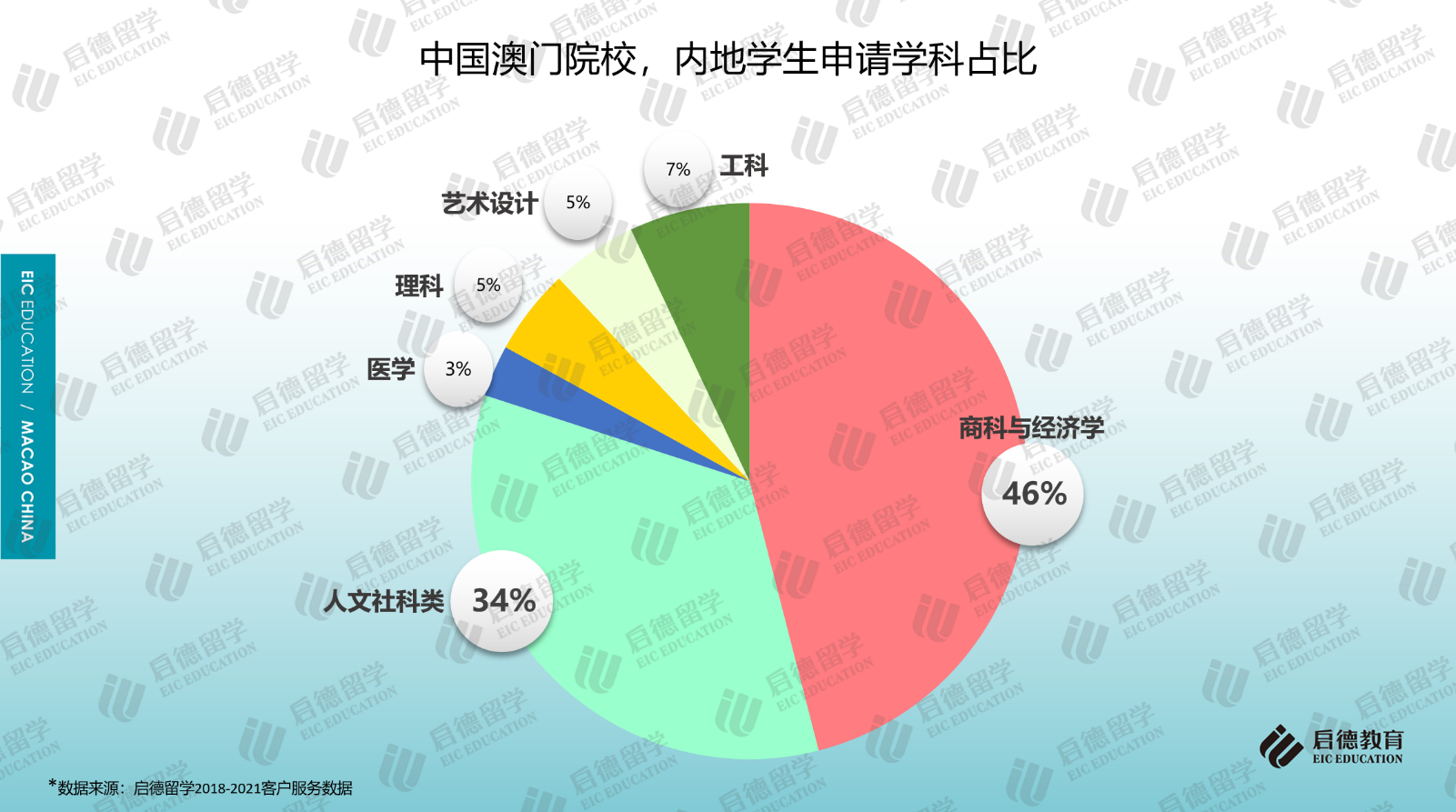啟德留學2018-2021客戶服務(wù)數(shù)據(jù)顯示,商科與經(jīng)濟學(46%)、人文社科類(34%)、理工科(12%)在澳門高校的申請占比位居前三。在商科與經(jīng)濟學的細分專業(yè)中,工商管理、旅游與酒店管理、會計的申請占比超過6成;在人文社科類的細分專業(yè)中,傳媒、法學、語言學的申請占比超過6成;電子與計算機(55%)成為理工科選擇最多的專業(yè)。作為澳門求學的主要學科,澳門院校的商科碩士專業(yè)對GMAT/GRE考試不作硬性要求。