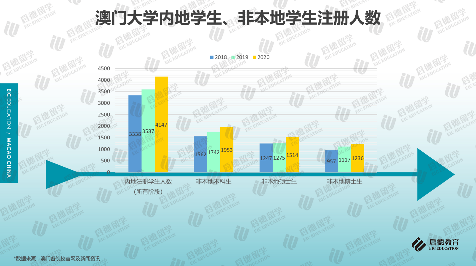 最近幾年,內(nèi)地學生赴澳門求學的人數(shù)保持增長,據(jù)澳門大學官網(wǎng)數(shù)據(jù)顯示,2020年,赴澳門大學求學的內(nèi)地注冊學生人數(shù)為4147人,相比2019年上漲了15.61%,相比2018年上漲了24.23%;2021/2022學年,澳門科技大學本科課程的內(nèi)地報名人數(shù)超過18000人,澳門城市大學本科課程的內(nèi)地報名人數(shù)接近13000人,計劃錄取866人,報錄比達到15:1。此外,2020年澳門大學本科(1953人)、碩士(1514人)、博士(1236人)階段的非本地生人數(shù)均呈穩(wěn)步上升,非本地學生包括來自中國內(nèi)地及其它國家與地區(qū)的學生。澳門高等院校的申請競爭遠比想象中激烈。