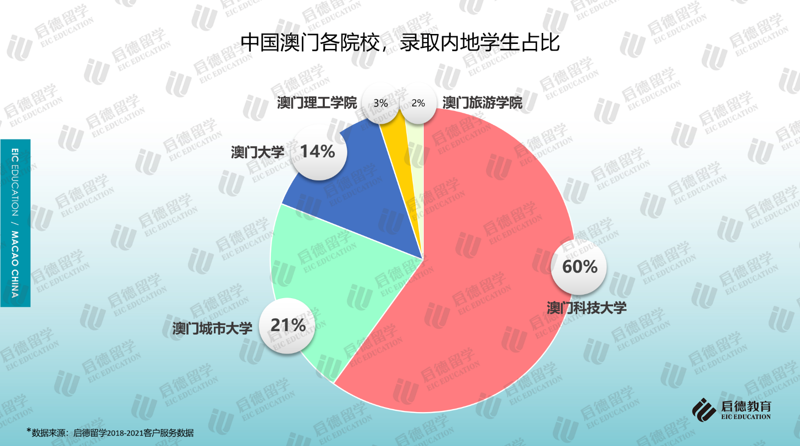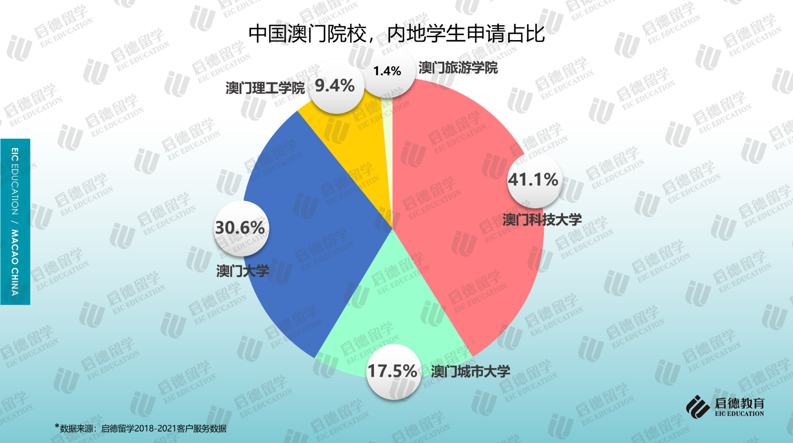 啟德留學2018-2021客戶服務(wù)數(shù)據(jù)顯示,澳門地區(qū)高校的申請中,七成以上申請澳門科技大學(41.1%)和澳門大學(30.6%);作為私立院校的澳門城市大學因?qū)W科設(shè)置比較全面,申請占比為17.5%;作為公立院校的澳門理工學院(9.4%)、澳門旅游學院(1.4%)由于專業(yè)設(shè)置較少,申請占比相對較少。從啟德留學澳門地區(qū)高校的錄取數(shù)據(jù)來看,澳門科技大學的錄取占比為60%,澳門大學的錄取占比為14%,澳門城市大學、澳門理工學院、澳門旅游學院的錄取占比分別為21%、3%與2%。