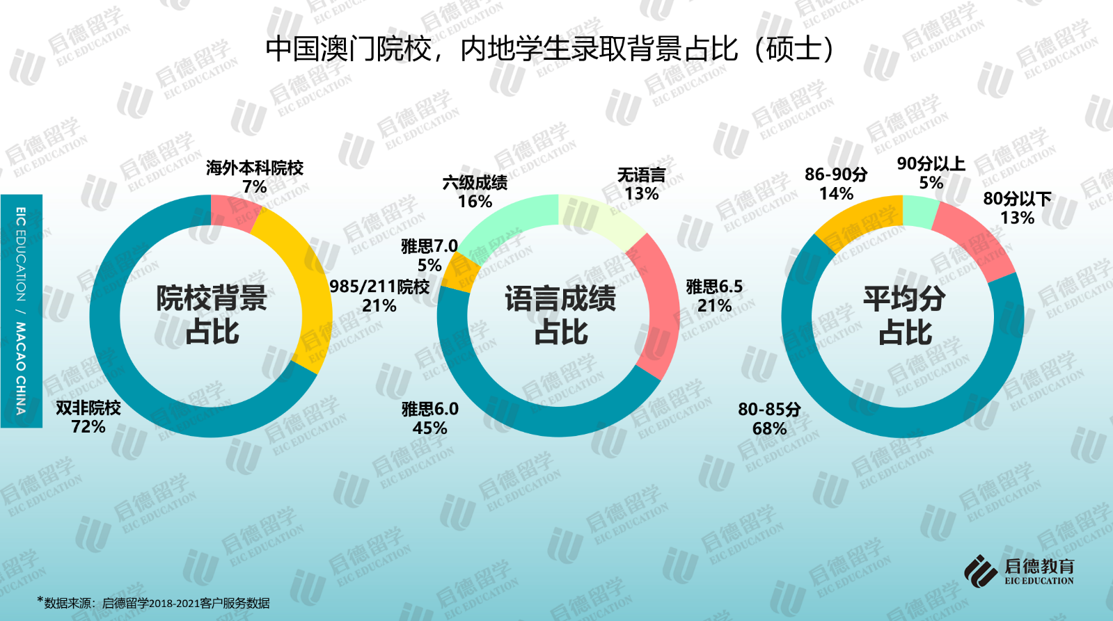 本科錄取中,澳門大學的要求較高,應(yīng)屆高考生申請人高考成績要達到一本線;碩士錄取中,只有澳門大學和澳門旅游學院要求碩士申請學生提交英語成績,雅思6分為澳門大學和澳門旅游學院的語言門檻要求,澳門大學碩士申請也可接受430分以上六級和TEM4/8成績;其它院校的大多數(shù)專業(yè)對英語成績無硬性要求。啟德留學2018-2021客戶服務(wù)數(shù)據(jù)顯示,2021年碩士錄取學生中,45%達到雅思6分的門檻成績,雅思成績6.5分以上達到26%,16%的學生只提供了合格的六級成績,13%為無語言錄??;七成以上的碩士錄取學生來自雙非院校;GPA在80分以上的占比為87%。