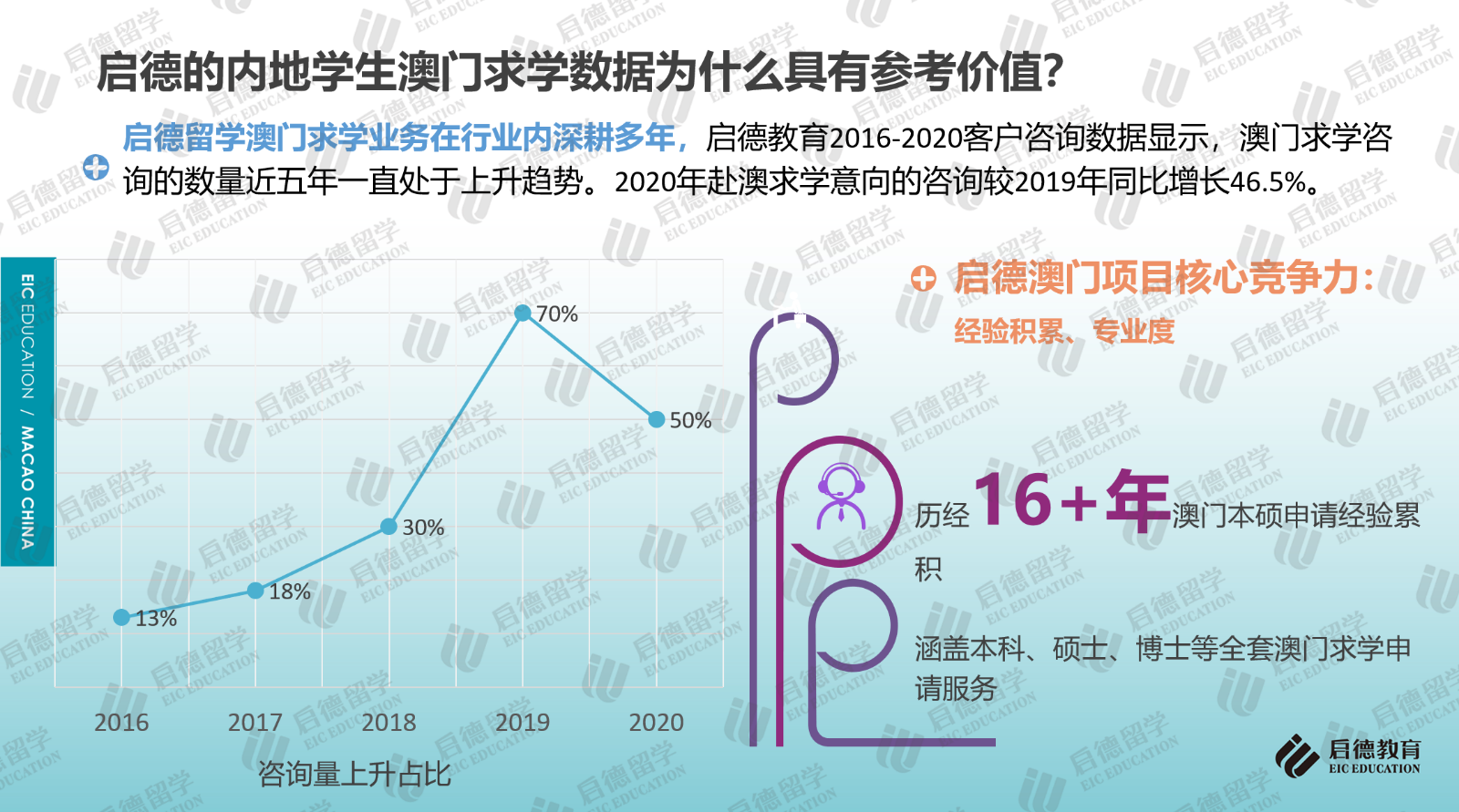 啟德留學2016-2020客戶服務(wù)數(shù)據(jù)顯示,澳門求學咨詢量近五年一直處于上升趨勢,2020年咨詢量較2019年同比增長46.5%。2021年10月31日,啟德留學在北京發(fā)布《2021中國澳門求學報告》,這也是行業(yè)內(nèi)首次針對中國內(nèi)地學生赴澳門求學情況進行的梳理與分析,《報告》結(jié)合澳門高校官方數(shù)據(jù)及最近四年啟德學生澳門求學申請與錄取數(shù)據(jù),重點分析了澳門求學的申請要求與錄取趨勢、澳門六大高校的特色與優(yōu)勢專業(yè)、澳門本地就業(yè)情況,并就赴澳門求學規(guī)劃、申請準備及求職就業(yè)等方面提供了建議。