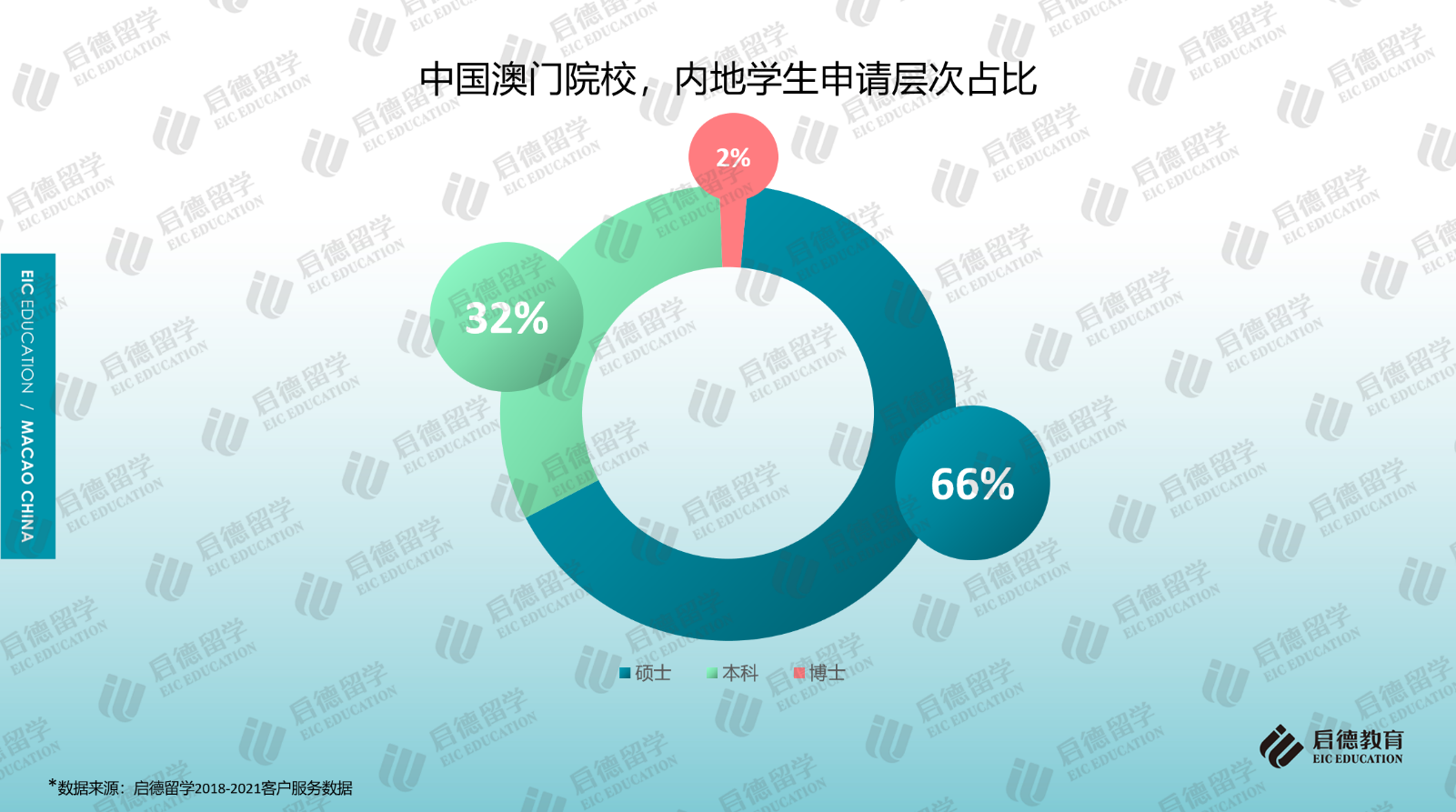 啟德留學2018-2021客戶服務(wù)數(shù)據(jù)顯示,前往澳門求學的內(nèi)地學生選擇攻讀碩士的比例較高,且申請量呈現(xiàn)逐年小幅上升的趨勢,2021年為66%;攻讀本科的占比超過30%,除高考生外,今年也開始有參加國際考試的內(nèi)地學生申請澳門的高校。QS官網(wǎng)2021年數(shù)據(jù)顯示,澳門大學非本地生(3921人)中研究生與本科生的占比分別為55%與45%;澳門科技大學非本地生(8869人)中,研究生與本科生的占比分別為32%與68%。
