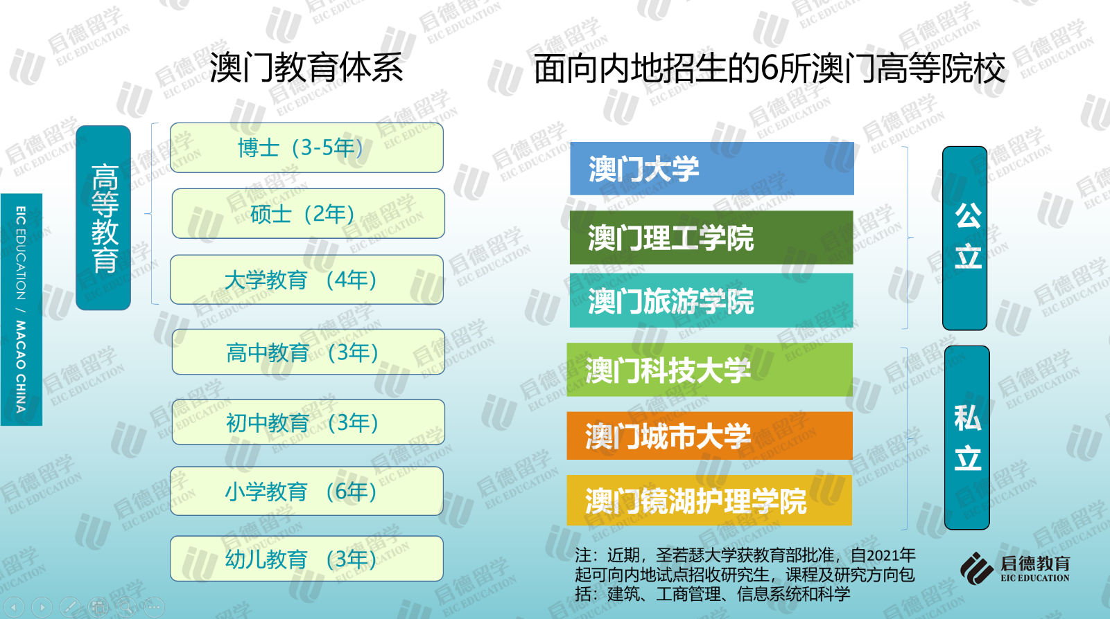 作為中西文化交匯的國際旅游城市,中國澳門的輕工業(yè)、旅游業(yè)、酒店業(yè)和娛樂場使其成為中外游客青睞的旅游度假勝地。澳門與香港同樣都具有獨特的地緣優(yōu)勢,既有中國文化的根基,又融會貫通了歐美教育的優(yōu)勢,中文、葡文、英文學制并存的多語言教學與多元文化交融的國際化環(huán)境,為學生提供了開闊的國際視野和學術(shù)氛圍,也為當?shù)馗叩冉逃陌l(fā)展創(chuàng)造了良好的條件。目前,澳門大學、澳門理工學院、澳門旅游學院、澳門城市大學、澳門鏡湖護理學院、澳門科技大學等6所高校獲教育部批準可面向內(nèi)地招收本科生及研究生,圣若瑟大學獲教育部批準自2021年起可面向內(nèi)地試點招收研究生。