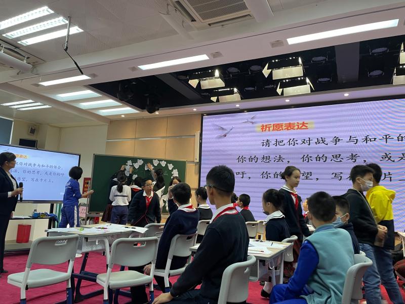 上午8:30分,益田小學(xué)一樓禮堂內(nèi)首先進(jìn)行室內(nèi)升旗儀式,在場(chǎng)師生滿懷祭奠之情,為受難者默哀一分鐘,致敬逝者,寄托民族哀思。接著,四(3)班中隊(duì)表演了相關(guān)詩朗誦以及“銘記歷史,努力學(xué)習(xí)宣誓“活動(dòng),最后,益田小學(xué)名師、福田區(qū)品牌課程主持人嚴(yán)霞老師帶領(lǐng)學(xué)生上了一節(jié)別開生面的思政課 《和平是什么》,嚴(yán)老師通過閱讀相關(guān)繪本和文字,以及學(xué)生喜聞樂見的講故事、繪本閱讀、觀看視頻等多樣的教學(xué)方式,引導(dǎo)學(xué)生了解公祭日的由來,思考、感知戰(zhàn)爭(zhēng)的慘痛與和平的可貴,時(shí)刻謹(jǐn)記中國遭受過的屈辱歷史決不能重演!