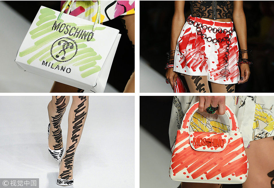 Moschino 2019春夏系列發(fā)布會于當(dāng)?shù)貢r間20日在米蘭舉行,滿場的涂鴉元素好玩的不得了,信手涂鴉在服飾和配飾上,瞬間放下束縛回歸本真,帶你追憶無憂無慮的孩童時代~ (圖片來源:視覺中國)