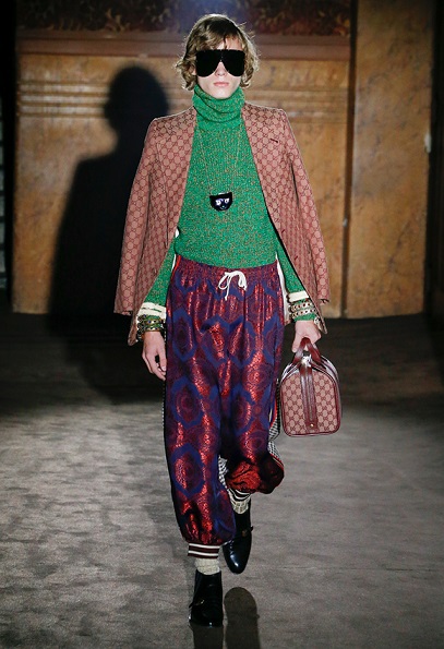 熊梓淇穿著Gucci2018秋冬系列Look49飾動漫圖案拼接大衣,條紋襯衣,搭配米色休閑長褲及Flashtrek系列運動鞋。