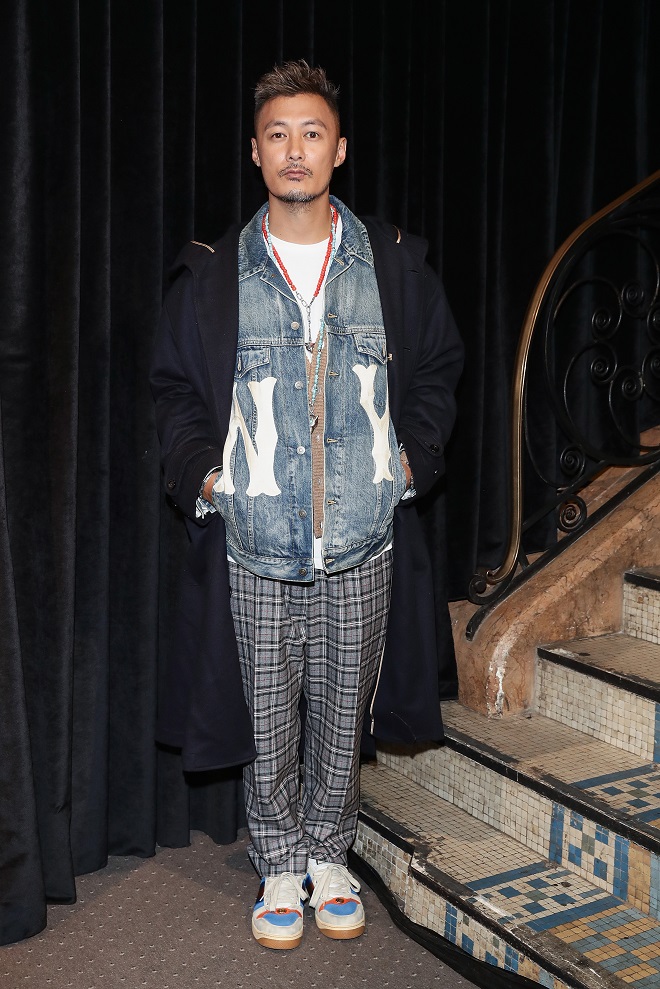 余文樂穿著Gucci2018秋冬系列飾紐約洋基隊?標志牛仔夾克,駝色針織開衫,白色T恤,格紋長褲,搭配深色羊絨大衣,牛頭裝飾項鏈,虎頭裝飾項鏈及做舊款運動鞋。