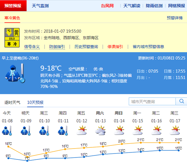 深圳預(yù)計8-9日受強冷空氣影響,陰天有小雨,氣溫逐漸下降,8日傍晚前后降至9℃,北風(fēng)加大,沿海和高地最大陣風(fēng)8-9級左右,9日最低氣溫降至7℃左右,北部及山區(qū)再低1-2℃;展望10日起雨停,轉(zhuǎn)多云到晴,空氣干燥,早晚寒冷。