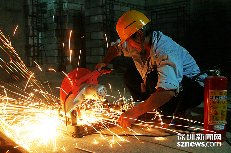 在地鐵6號(hào)線大浪站,一名地鐵工人正在進(jìn)行材料切割,火花飛濺,旁邊是干粉滅火器