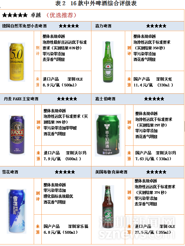 16款中外啤酒中,6款評(píng)級(jí)五星,國產(chǎn)與進(jìn)口各3款,分別為:德國自然渾濁型小麥啤酒 、喜力啤酒 、丹麥FAXE王室啤酒 、嘉士伯啤酒、 雪花啤酒、美國布魯克林啤酒。獲得四星評(píng)級(jí)的有6款,國產(chǎn)5款進(jìn)口1款,4款三星評(píng)級(jí)均為進(jìn)口啤酒。另外,16款中外啤酒均未出現(xiàn)違規(guī)使用添加劑和污染物超標(biāo)情況,均符合國家食品安全標(biāo)準(zhǔn),甲醛含量均優(yōu)于國標(biāo)要求。