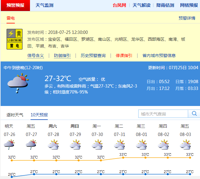 今日,仍以多云天氣為主,部分時間天色陰沉,仍有陣雨或雷陣雨,部分時間雨勢較大。最低氣溫在26℃左右,最高氣溫升至31℃左右。降雨時,能見度明顯下降,最低能見度在10公里以內(nèi),駕車應(yīng)注意交通安全,外出需采取防范措施。