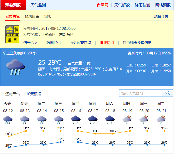 南海熱帶低壓已于11日10時35分在陽江海陵島登陸。受其外圍環(huán)流影響,10日夜間到11日白天,深圳普降中到大雨,局部暴雨,最大雨量出現(xiàn)在鹽田三洲田,為75.1毫米。預計南海熱帶低壓未來將在陽江到茂名一帶沿海徘徊。持續(xù)受其環(huán)流影響,今日,深圳將以陰天間多云為主,還會出現(xiàn)間歇性陣雨或雷陣雨,雨量將達大雨級別,局部暴雨。