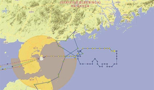 ▲臺(tái)風(fēng)"貝碧嘉"移動(dòng)路徑曲折,昨晚已在廣東省雷州市沿海登陸。