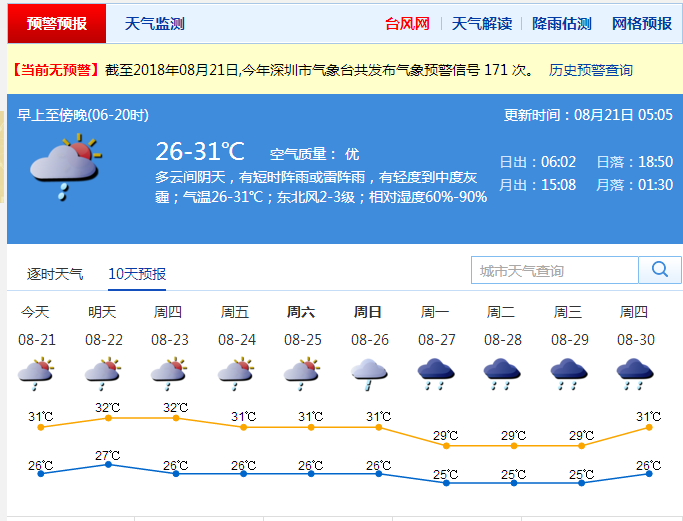 據(jù)深圳氣象臺預(yù)計,21日~22日,深圳多云,局地易出現(xiàn)雷陣雨,風(fēng)力持續(xù)微弱,部分時間還有輕霧或霾,能見度較差。其中,21日早晚濕度大,有輕霧,中午以后濕度有所下降,大部分地區(qū)輕霧會轉(zhuǎn)成輕度灰霾。