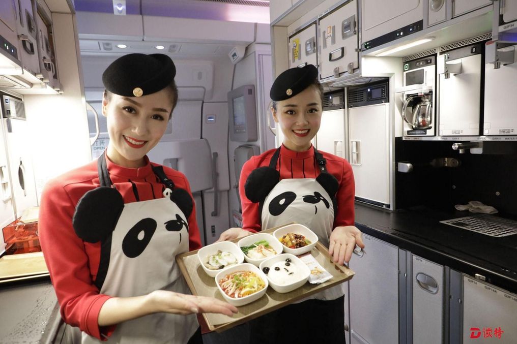 除了色彩繽紛的熊貓彩繪之外,機(jī)艙內(nèi)的熊貓?jiān)仉S處可見,仿佛把大熊貓基地搬上了天。