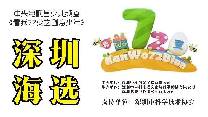 9月15日(本周六),央視“看我72變”欄目組將聯(lián)合深圳市科學技術協(xié)會、深圳市中心書城、中科創(chuàng)造力實驗室,在中心書城大臺階舉辦第10屆“看我72變”之創(chuàng)意少年(深圳賽區(qū))的海選。只要你的孩子有創(chuàng)意有想法,都可以來到中心書城參加海選,發(fā)揮自我創(chuàng)意,結識新朋友。征集節(jié)目類型包括但不限于藝術創(chuàng)意表演:舞蹈、音樂、書法、輪滑、體育類等,科技創(chuàng)意:科技作品展示等,優(yōu)勝者將有機會登陸央視舞臺參加節(jié)目錄制。