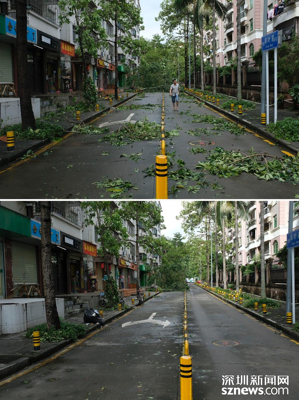 商報東二路翠葉道清理前后對比(上圖:2018年9月17日,臺風過后,倒塌的樹木堵住路面,無法通行。下圖 2018年9月18日早上,樹木被清掃了一半,右車道可以通車)