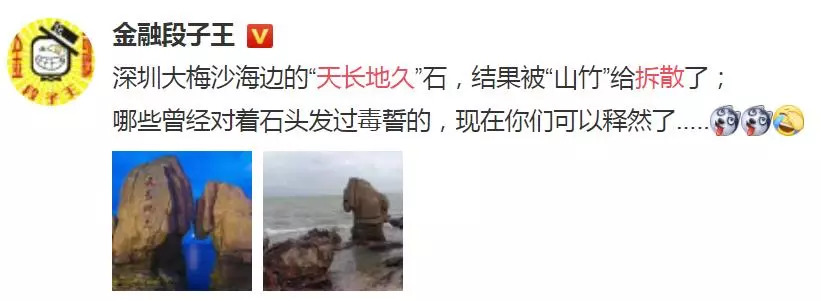 “天長地久”石被吹倒的畫面,在2008年,強臺風(fēng)“黑格比”來襲時,同樣出現(xiàn)過,只不過當(dāng)時的“天長地久”石,被吹倒的是右邊的石頭。