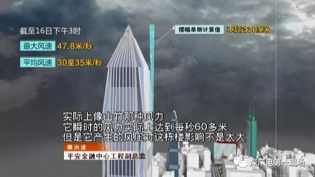 工程人員表示,平安金融中心抗風設(shè)計能應(yīng)對平均風速為60米/秒,陣風風速最高至80米/秒的臺風。在此模擬情景下,塔頂擺幅單側(cè)計算值為67厘米。