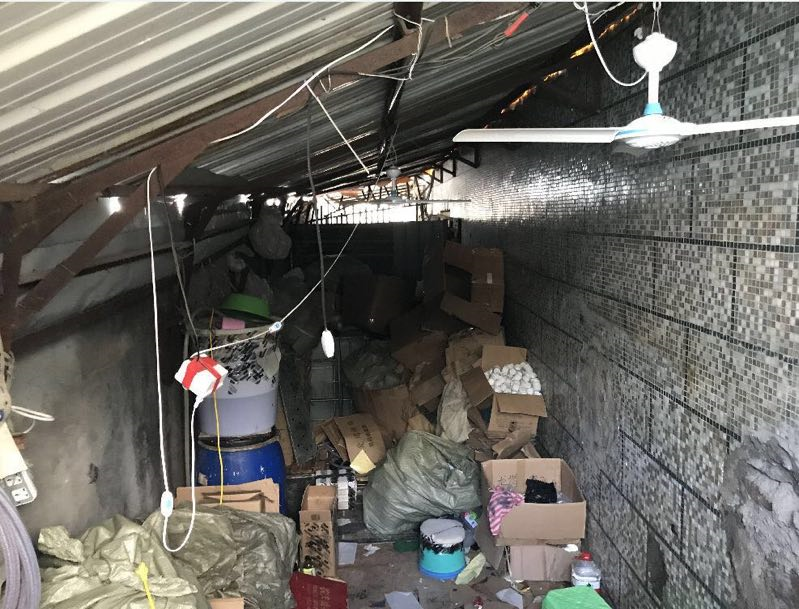 執(zhí)法人員來到位于龍東社區(qū)同昌路的一個工業(yè)區(qū)進(jìn)行突擊檢查。剛進(jìn)入該工業(yè)區(qū),執(zhí)法人員就發(fā)現(xiàn)有幾間鐵皮房大門緊鎖,通過門縫還能看到大量各品牌的洗衣粉、消毒液,以及各式設(shè)備數(shù)臺。經(jīng)檢查,現(xiàn)場共有這類鐵皮房3個,分散在工業(yè)園區(qū)3個不起眼的角落,占地面積超過200平方米。鐵皮房內(nèi)環(huán)境惡劣、電線亂搭,地上堆滿各種標(biāo)識的加工原料以及各種日化品牌的包裝袋,數(shù)量巨大。