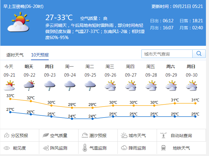 深圳市氣象臺提醒,21日深圳天氣炎熱,請注意做好防暑降溫;部分時間有輕微灰霾,建議根據灰霾條件合理安排戶外活動。此外,中秋假期出行或有陣雨,注意攜帶雨具。