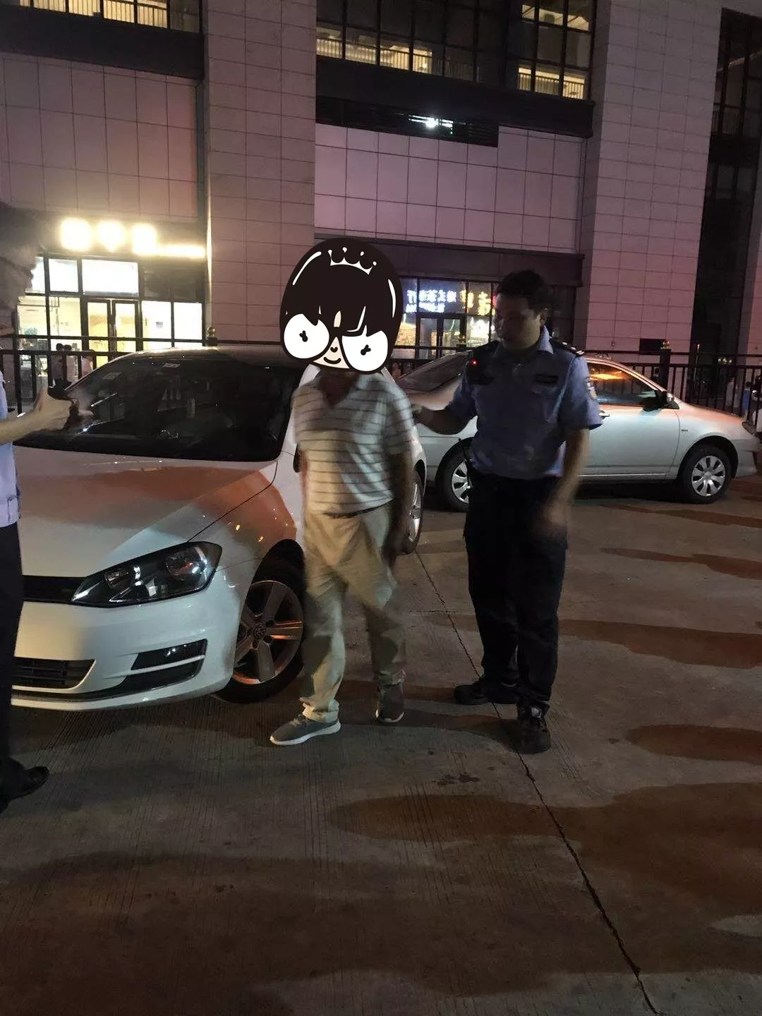 原來當(dāng)晚21時左右,一輛小轎車正準(zhǔn)備從該大廈停車場出口處出去,而這時,龐某強(qiáng)駕駛的白色大眾牌轎車剛好沖到了從停車場的地面出口處??紤]到安全第一,保安員立即上前拍打龐某強(qiáng)所駕駛車輛的車前蓋,示意其盡快駛離防止意外的發(fā)生。