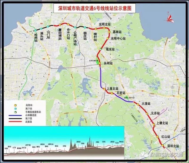深圳地鐵6號(hào)線全長約49.4km,其中一期工程長約37.6km,起自深圳北站綜合交通樞紐,終于松崗站,設(shè)車站20座(其中地下站5座,高架站15座),與4、5、11、13、15號(hào)線及廣深港客運(yùn)專線綜合換乘。