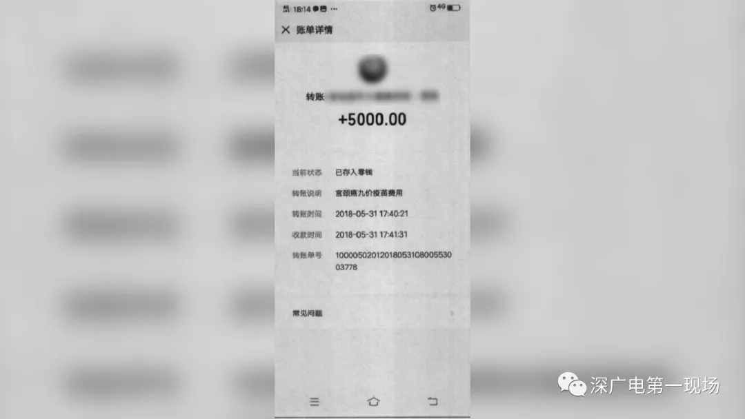 今年5月份,寶安的郭小姐接到前同事蔣某的推銷電話,自稱可以預(yù)約到香港注射HPV9價(jià)疫苗,而郭小姐剛好有這方面的需求,眼看辦公室的好多女生都轉(zhuǎn)錢找蔣某預(yù)約,自己不假思索也轉(zhuǎn)了五千。