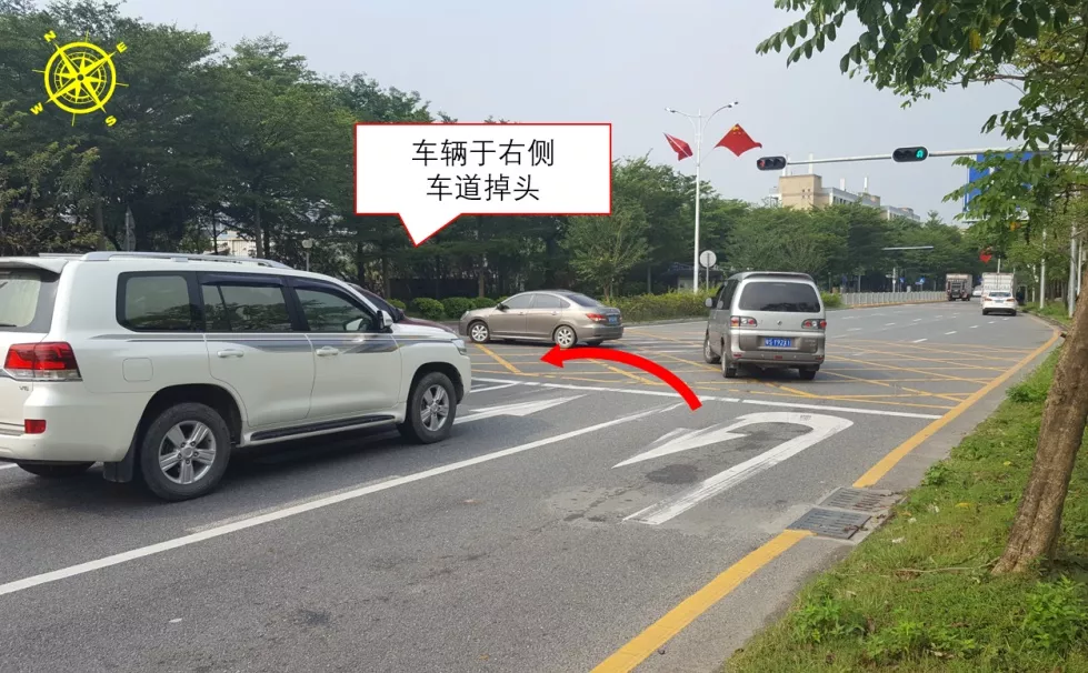 福鳳/騰豐三路口東側(cè)為鳳凰山旅游區(qū),通勤車流較多?,F(xiàn)狀路口未設置紅綠燈,人車交織嚴重,交通秩序混亂,易發(fā)交通事故。9月14日,深圳交警啟用福鳳/騰豐三路口信號燈。為解決掉頭車轉(zhuǎn)彎半徑不足問題,進一步在距路口約96米處開設掉頭口,并以最外側(cè)車道作為掉頭車道,同時與福鳳/騰豐三路口實施聯(lián)動設置燈控掉頭。該路口是寶安首個“一機兩控”+外側(cè)掉頭微創(chuàng)新路口。