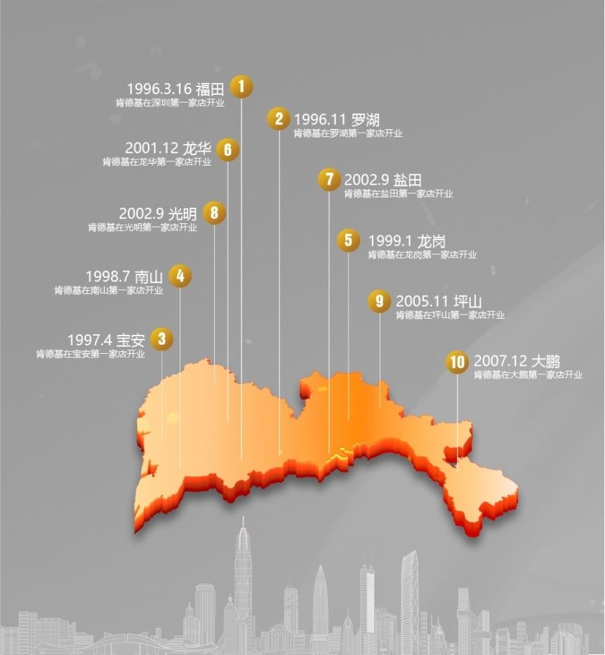 2007年,是深圳的大年份,也是肯德基的大年份。2007年,深圳人均GDP達(dá)到10684美元,首次超過1萬美元??系禄拈_店數(shù)量也在那一年突破了100家,達(dá)到108家。同時(shí),肯德基完成了對(duì)現(xiàn)在深圳十區(qū)的開店布局。