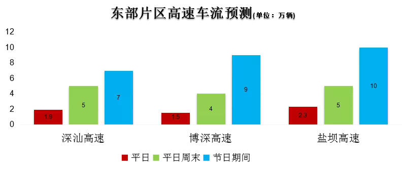 預計東部片區(qū)高速在假期后兩天車流增加,從下午至晚上21時許恢復正常,尤其是深汕高速和鹽壩高速從每天10時開始車流增大,并于19時左右達到峰值,車流緩行情況將一直持續(xù)到晚上23時。