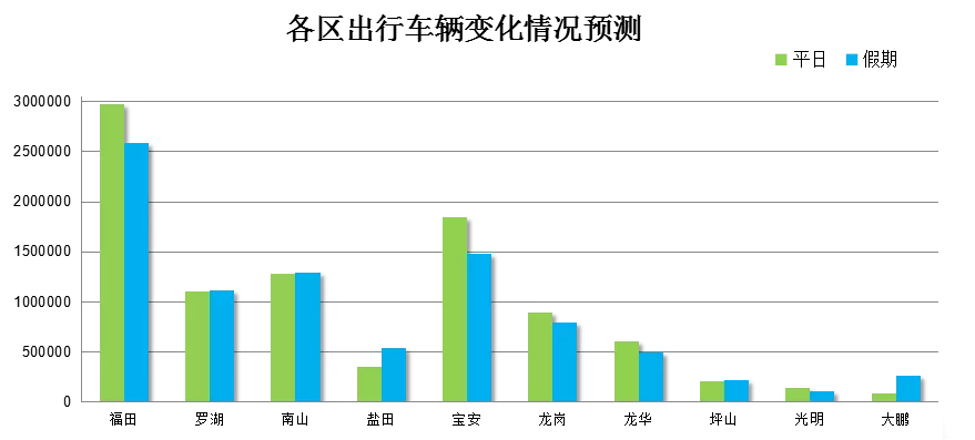 除以上兩個區(qū)域外,我市其余各區(qū)車輛會較平日有所下降,而原關外的福田、寶安、龍崗,出行車輛數(shù)下降較為明顯,整體來看,全市出行車輛數(shù)將減少6%。