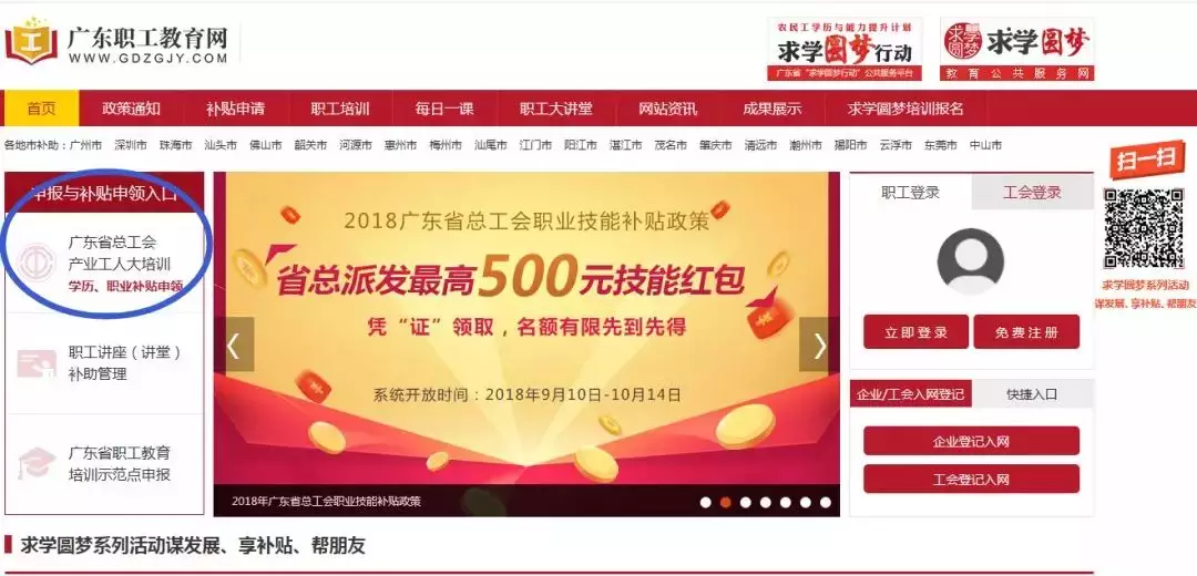 在網(wǎng)站(www.gdzgjy.com)首頁左側(cè)【申報與補貼申領(lǐng)入口】,點擊“廣東省總工會產(chǎn)業(yè)工人大培訓(xùn)學(xué)歷、職業(yè)補貼申領(lǐng)”界面,選擇右側(cè)“職業(yè)技能提升補助”點擊【進入申領(lǐng)】。