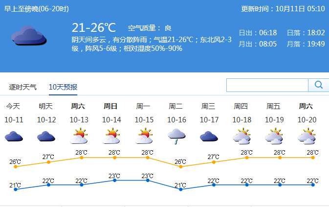 受弱冷空氣影響,預(yù)計11~12日有分散小雨,其中11日氣溫20 ℃ ~27 ℃。12日持續(xù)陰天,有分散陣雨,氣溫21 ℃ ~27 ℃。預(yù)計此次弱冷空氣影響持續(xù)到周末,13~15日晴天到多云,氣溫開始回升。16日將有新一輪冷空氣進入深圳,有一次降雨過程。