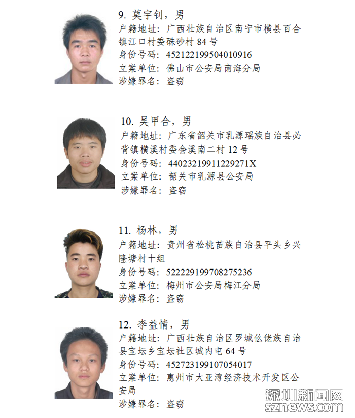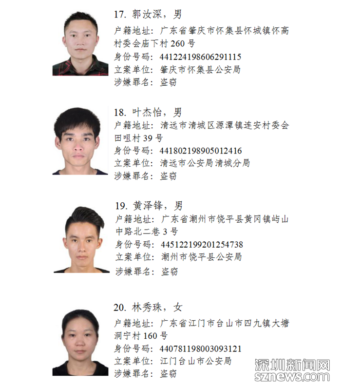 深圳新聞網(wǎng)11月5日訊(記者何暢)廣東省公安廳近日發(fā)布懸賞通告:廣東省公安廳決定從即日起公開(kāi)懸賞通緝30名在逃涉盜搶騙犯罪嫌疑人,希望廣大人民群眾積極提供在逃犯罪嫌疑人線索。