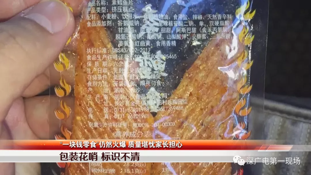 記者在這些食品外包裝上,發(fā)現(xiàn)有一部分包裝上標有生產(chǎn)日期、食品生產(chǎn)許可證編號和廠家地址電話,但也有一部分商品外包裝印刷粗糙,本該清楚標明的信息模糊不清,難以辨認。