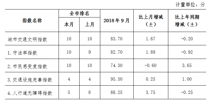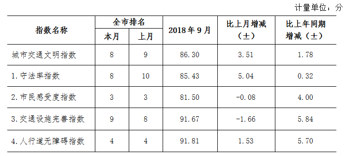 9月份深圳市城市交通文明指數(shù)為87.02分。與上月對比,四項分項指數(shù)呈“三升一降”現(xiàn)象。
