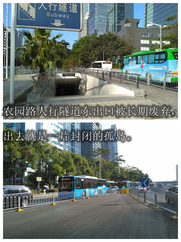 自2017年連通深南大道兩側(cè),可供行人通行的人行天橋被拆卸后,行人都只能從人行隧道過街。但奇怪的是,人行隧道的東出口處是一片被隔離、被荒廢的“孤島”,這讓需要從此出口通行的市民很尷尬。即使避開這個(gè)出口,選擇繞行,又容易在農(nóng)園路口與右轉(zhuǎn)車輛發(fā)生沖突?!罢娴暮転殡y我們啊?!笔忻駞窍壬C實(shí)了步行通過該路段的“艱難”。