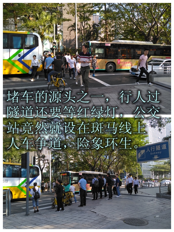 而在進(jìn)入人行隧道前,又需要等紅綠燈,且公交車站就設(shè)在這紅綠燈前的斑馬線上。“我不明白為何在交通這樣混亂的地方,要設(shè)置公交車站,也不知為何‘為難’的都是市民?!本W(wǎng)友“深圳大胡子”為這里每天通行的行人鳴不平,他希望能把招商銀行公交站原來的港灣式站臺(tái)恢復(fù),方便市民乘車,也希望能盡快恢復(fù)正常的過街通道。