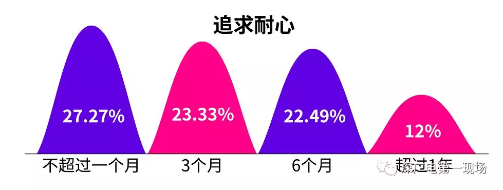 追求時(shí)間不超過(guò)一個(gè)月,23.33%的人追求時(shí)間為3個(gè)月,另外有22.49%愿意追求時(shí)間為6個(gè)月,僅有12%的單身男女追求喜歡的人愿意超過(guò)1年。
