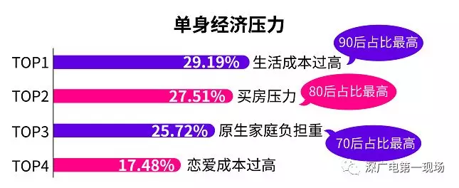 脫單難點(diǎn)中的經(jīng)濟(jì)壓力層面分析發(fā)現(xiàn),生活成本過(guò)高是影響脫單的最大單身壓力,其次是買房壓力,原生家庭負(fù)擔(dān)重以及戀愛成本過(guò)高。