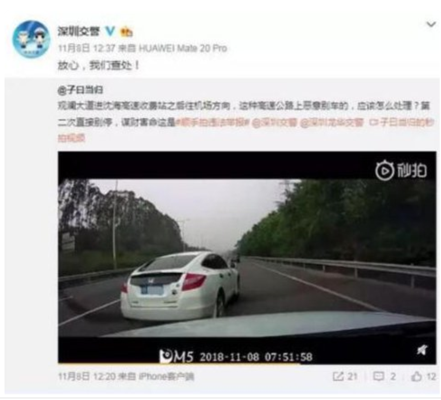 近日,深圳交警接到舉報(bào)稱(chēng):一公交大巴存在故意斗氣的情況,多次別停后方出租車(chē)。接到舉報(bào)后,交警立即展開(kāi)調(diào)查,調(diào)取雙方車(chē)輛行車(chē)記錄儀發(fā)現(xiàn),前車(chē)公交大巴從站臺(tái)駛出,因沒(méi)有及時(shí)避讓后方出租車(chē),導(dǎo)致的士司機(jī)狂按喇叭,緊接著公交大巴開(kāi)始呈 S型路線行駛,先右后左別停后方出租車(chē)三次!