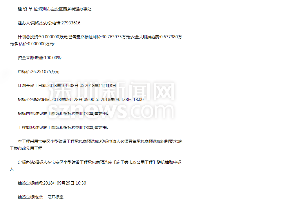 針對網(wǎng)友反映的情況,記者查閱相關(guān)資料發(fā)現(xiàn),寶安智園小學(xué)門前的施工工程于2018年9月28日公開招標。