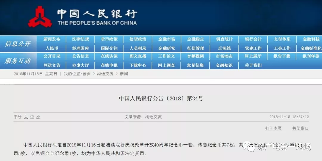 中國人民銀行決定自2018年11月16日起陸續(xù)發(fā)行慶祝改革開放40周年紀念幣一套。該套紀念幣共7枚,其中金質紀念幣1枚,銀質紀念幣5枚,雙色銅合金紀念幣1枚,均為中華人民共和國法定貨幣。面額分別分100元、50元、10元。