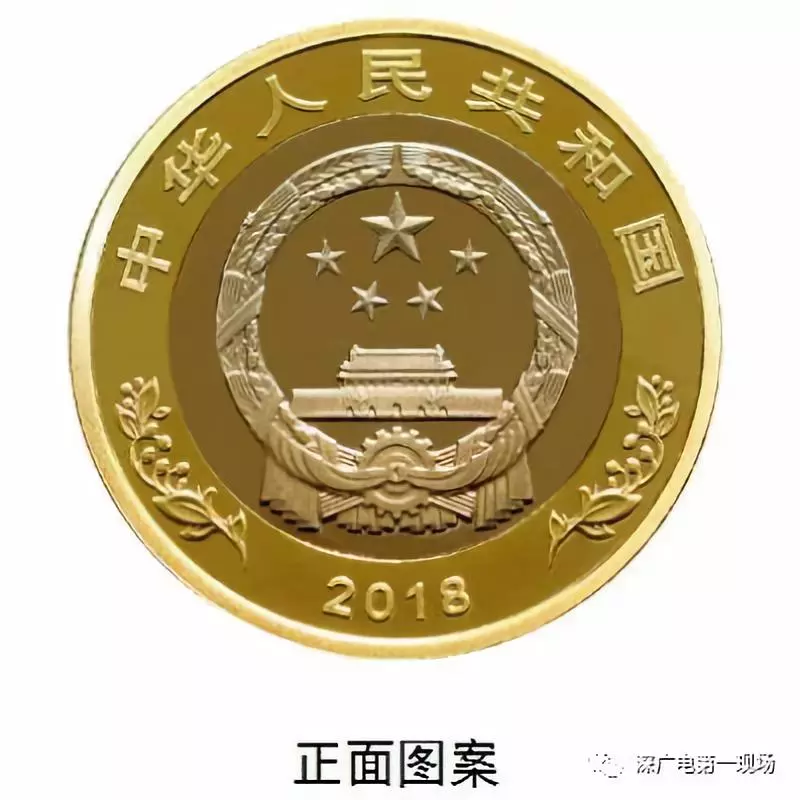 雙色銅合金紀(jì)念幣正面圖案為國徽,國徽上方刊“中華人民共和國”國名,下方刊年號(hào)“2018”字樣,左右兩側(cè)為果實(shí)圖案。