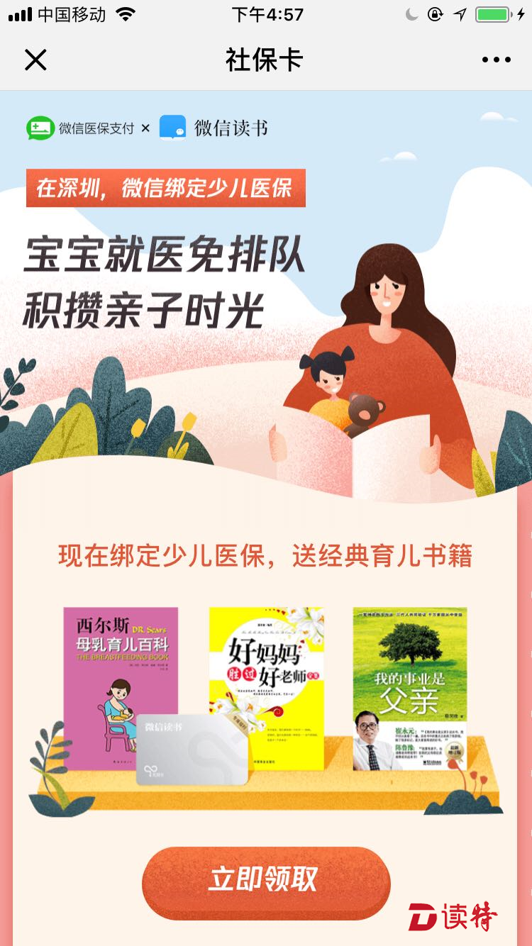 深圳特區(qū)報(bào)2018年11月21日訊 作為微信醫(yī)保支付的試點(diǎn)城市,深圳又開(kāi)通便民新服務(wù),全國(guó)內(nèi)率先開(kāi)通微信綁定少兒社???,支持少兒醫(yī)保線上支付服務(wù)。記者獲悉,11月20日起,父母在微信綁定孩子的少兒社???,就可以用微信上通過(guò)醫(yī)保給孩子繳納掛號(hào)、就診費(fèi)用,省去排隊(duì)煩惱。此外,20日起,用戶在微信綁定少兒社???,可免費(fèi)領(lǐng)取微信讀書(shū)三本經(jīng)典育兒書(shū)籍和3天無(wú)限閱讀卡兌換碼。