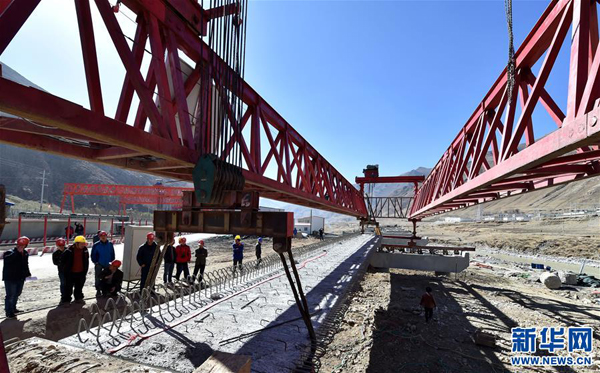 中鐵大橋局工作人員在拉薩至那曲高等級(jí)公路昂嘎大橋施工現(xiàn)場(chǎng)作業(yè)。新華社記者覺果 攝