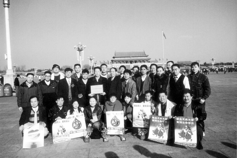 1999年,27位深圳市民獲得全國(guó)首批無償獻(xiàn)血金質(zhì)獎(jiǎng)杯后在天安門前合影。余海蓉 攝