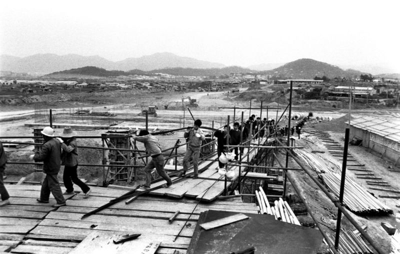 1992年,中心區(qū)四橋一廣場(chǎng)進(jìn)入緊張施工,圖為金田立交橋的施工情景,背景是蓮花山。 馬樹(shù)華 攝